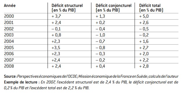 La Suède a maintenu ce principe pour le cycle en cours. En 2009, le déficit public a été de 1,2 % du PIB. Ce déficit se décompose en 2,5 % de déficit conjoncturel et 1,3 % d’excédent structurel.