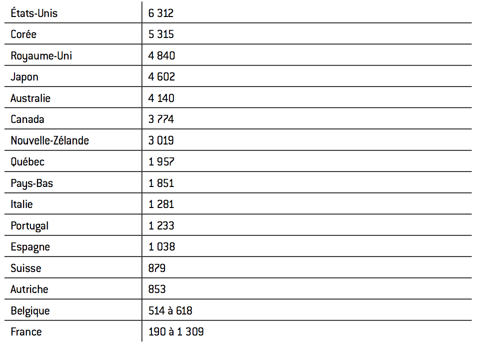 Tableau 1 : Droits de scolarité perçus par les établissements publics pour une formation universitaire à temps plein dans les pays de l’OCDE en 2008-2009 (droits de scolarité annuels moyens en dollars américains)