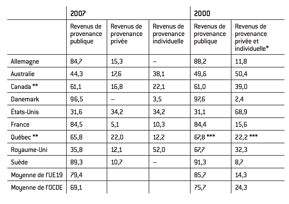 Tableau 2 : Répartition du financement public, privé et individuel des établissements d’enseignement universitaire, Québec et OCDE, 2000 et 2007 (en % du financement total)