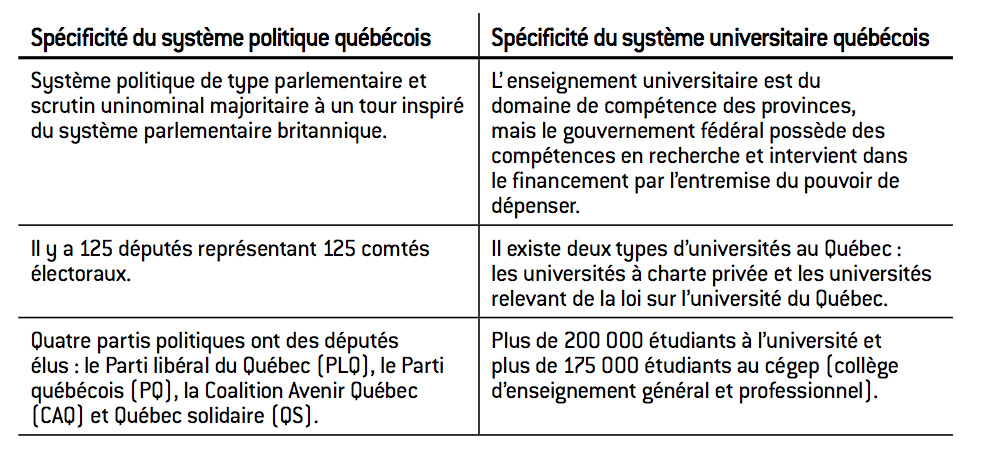 Encadré 1 : Spécificité du système politique et universitaire québécois