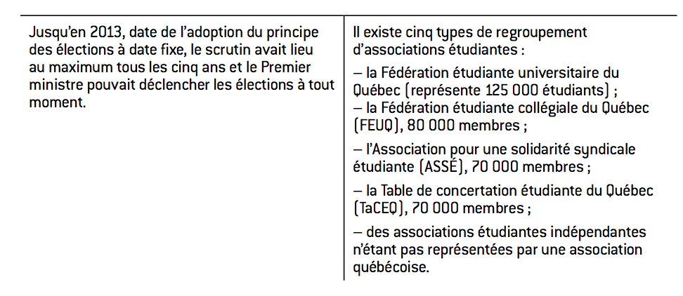Il existe un choix stratégique de la part du gouvernement quant à cette façon de négocier. En 2005, lors d’une grève étudiante, une situation semblable s’était produite et la FEUQ et la FECQ avaient accepté de négocier sans la présence de ce qu’était l’équivalent de la CLASSE (Coalition large de l’Association pour une solidarité syndi- cale étudiante) à cette époque, la CASSE (Coalition de l’Association pour une solidarité syndicale étudiante). L’analyse des raisons expliquant les différents motifs de la FEUQ et de la FECQ dans ce cadre-ci serait trop longue à produire pour cette note de recherche.