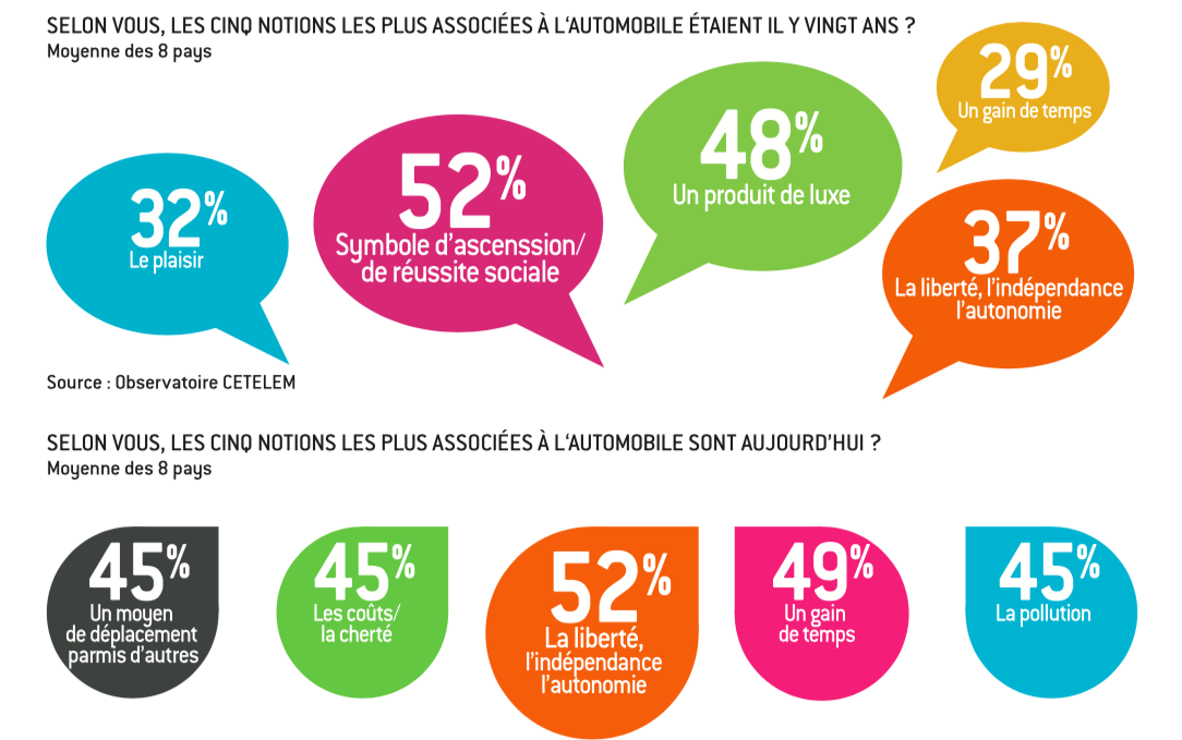 La comparaison des données de l’Observatoire Cetelem de l’automobile sur vingt ans montre bien une inflexion des motivations d’achat. Le plaisir, qui dominait il y a vingt ans, n’est plus, officiellement, l’image que projette l’automobile. Il en est de même pour la dimension symbolique d’ascension sociale. D’après l’édition 2014 de l’Observatoire Cetelem, ce qui caractérise aujourd’hui l’automobile est plus le sentiment d’une banalisation utilitaire du produit, un coût de possession élevé et une empreinte forte sur l’environnement.