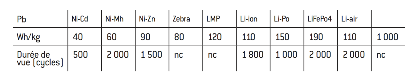 Pb : plomb. Ni-Cd : nickel cadmium. Ni-Mh : nickel métal hydrure. Ni-Zn : nickel zinc. Zebra : chlorure de sodium. Li-ion : lithium ion. Li-Po : lithium polymère. LiFePo4 : lithium phosphate. Li-air : lithium dioxygène.