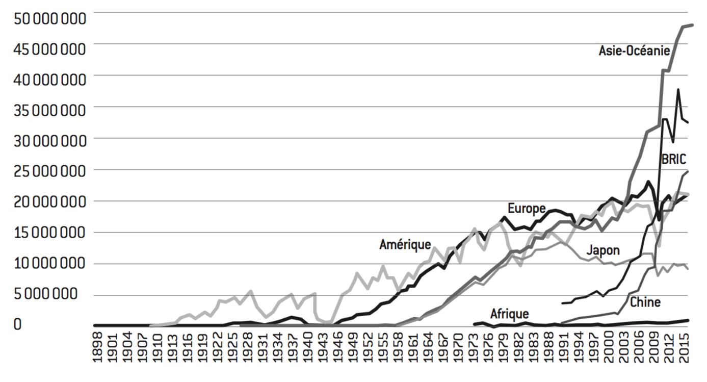 La production automobile des quatre continents et de certains pays émergents de 1898 à 2015