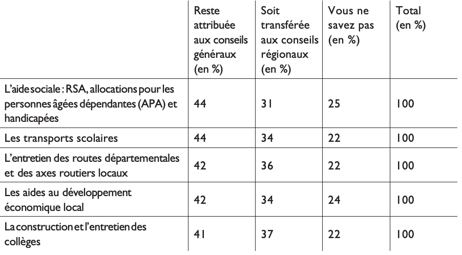 Question : Vous savez que dans le cadre de la réforme territoriale, les compétences actuelles des conseils généraux, c’est-à-dire les départements, pourraient être attribuées aux conseils régionaux. Pour chacune des compétences suivantes, estimez-vous qu’il faudrait qu’elle reste attribuée aux conseils généraux ou qu’elle soit transférée aux conseils régionaux ?