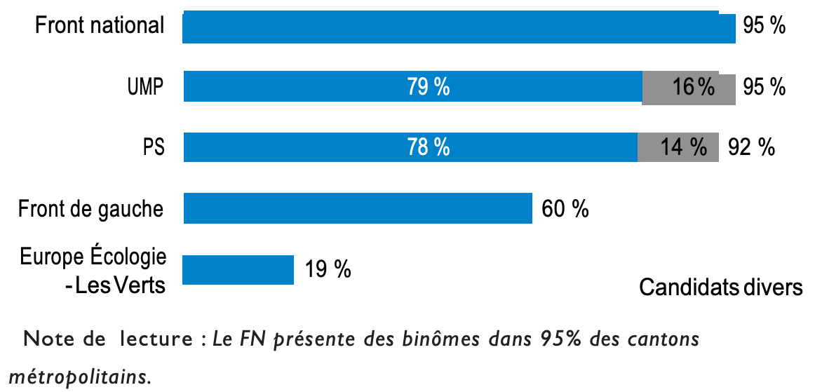 Le dénombrement sur la base des données publiées par le ministère de l’Intérieur a permis d’établir un état des lieux des forces en présence. Le FN affichait le meilleur taux de couverture, avec une présence de binômes dans 1.896 cantons sur 1.995, soit un taux de 95%. Pendant longtemps, et même lors des élections municipales de mars 2014, la formation frontiste a éprouvé des difficultés à mailler le territoire et a souffert de ressources militantes limitées. Lors des cantonales de 2011, par exemple, le FN n’avait aligné que 1.360 candidats alors que 2.000 cantons étaient soumis à renouvellement (soit un taux de couverture de 67%). Il semblerait que cet obstacle a été surmonté et qu’en dépit de polémiques sur le profil et le recrutement de personnalités controversées dans différents cantons, le parti se soit constitué un vivier militant suffisamment étoffé pour se présenter quasiment partout. On notera que parmi les 1.560 élus municipaux que le FN a fait élire en mars 2014, 1.170 étaient candidats aux départementales. Ce taux de couverture presque total conjugué à sa très forte audience attendue – un sondage Ifop pour Le Figaro créditait le FN de 30% d’intentions de vote à quelques jours du scrutin – pouvait déboucher, lorsque le ministère de l’Intérieur totaliserait les résultats de chaque canton, sur un score national très élevé.