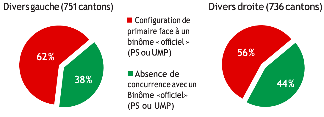L’UMP, quant à elle, couvrait moins de 50% des cantons dans certains départements favorables à la gauche, qu’il s’agisse de l’Ariège, du Tarn, du Gers, du Lot, de la Haute-Vienne et des Côtes-d’Armor, mais aussi dans différents territoires pourtant marqués à droite. C’est le cas dans le Cantal, l’Aveyron, la Lozère, la Manche ou bien encore dans l’Est, dans l’Aube, la Haute-Marne, les Vosges ou la Meuse, du fait de la présence de candidats divers droite, UDI ou Union du centre, alors même que bon nombre de ces conseils généraux étaient dirigés par un président UMP.