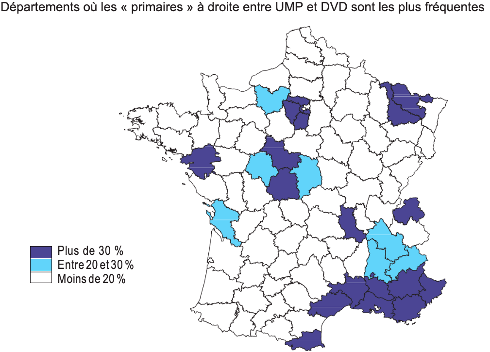 Les cartes 1 et 2 représentent les départements où les dissidences exercées par les divers droite et les divers gauche ont été proportionnellement les plus nombreuses. On constate une forte présence des DVD en situation de primaires en Île-de-France (notamment du fait d’un important contingent de binômes Debout la France de Nicolas Dupont-Aignan) et en Rhône-Alpes, mais aussi et surtout dans quasiment tous les départements méditerranéens. Les candidats de l’UMP ou de l’Union de la droite affrontaient ainsi des DVD dans les deux tiers des cantons des Bouches-du-Rhône et dans la moitié de ceux du Vaucluse et des Alpes-Maritimes. Cette forte dispersion pouvait apparaître particulièrement dangereuse dans une zone où la poussée frontiste risquait d’être très puissante mais le risque d’une non-qualification de la droite au second tour était à relativiser car la gauche était structurellement faible dans cette région et également divisée.