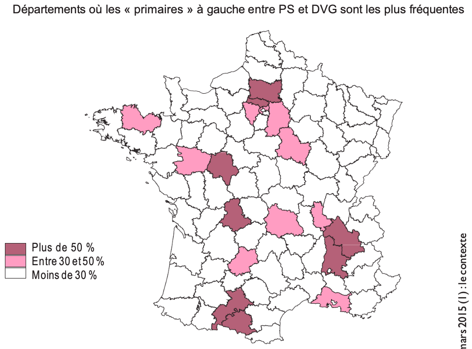 Évaluée selon le nombre de binômes présentés, la concurrence la plus vive pour le PS était celle du Front de gauche qui l’affrontait dans un canton sur deux. Soucieuse de préserver ses mairies et son réseau d’élus municipaux, la direction du PCF avait largement joué le jeu de l’union à gauche dès le premier tour des municipales dans de nombreuses communes il y a un an seulement. Si cette décision tactique, qui avait fortement irrité Jean-Luc Mélenchon, avait pu être justifiée idéologiquement en mettant en avant les bilans et les projets municipaux des équipes de gauche, le paysage politique avait beaucoup évolué en douze mois. Avec l’arrivée de Manuel Valls à Matignon et d’Emmanuel Macron à Bercy, le virage social-libéral s’était encore nettement accentué, à tel point que le prix idéologique pour justifier des candidatures communes devenait beaucoup trop élevé pour le PCF. Dans ce contexte, on a observé un nombre élevé de primaires FdG-PS en Île-de-France, notamment dans le département de la Seine-Saint-Denis, longtemps dirigé par le PCF, avec des duels dans 90% des cantons séquano- dionysiens. C’était le cas également dans d’autres bastions communistes : duels FdG-PS dans 74% des cantons de Seine-Maritime et dans 78% de ceux du Nord, mais seulement 42% dans l’Allier, conseil général également présidé par un communiste. Mais cette combativité a été très fortement tempérée dans certains départements où la menace frontiste était réelle et où le FdG a conclu des alliances avec les autres formations de gauche. Ainsi, en vertu d’un accord avec EELV, on ne comptait aucun binôme estampillé Front de gauche dans l’Oise (des membres du FdG étaient présents dans certains binômes, mais ces derniers n’étaient pas siglés FdG). On n’en dénombrera de la même façon que dans 12% des cantons du Vaucluse, dans 22% de ceux de la Somme et dans 29% de ceux de l’Aisne. Mais en dépit de la pression frontiste s’exerçant également dans d’autres départements, le Front de gauche a quand même voulu se compter en présentant par exemple des binômes dans 57% des cantons du Var, 59% de ceux des Alpes-Maritimes et dans 81% de ceux de Moselle. On notait enfin une présence très clairsemée du Front de gauche dans des départements comme la Drôme ou l’Yonne (du fait d’une alliance avec EELV), dans les Côtes-d’Armor (dans plusieurs cantons des tickets PS-PCF ont été constitués) ou bien encore dans le Maine-et-Loire où le PCF s’est allié à Nouvelle Donne.