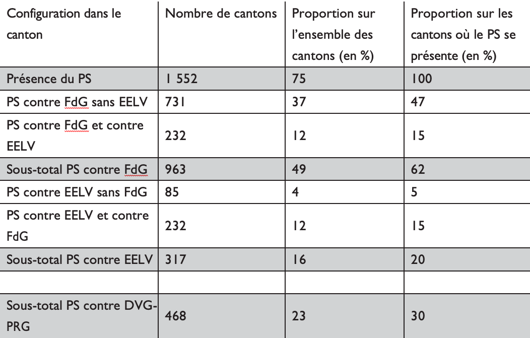 Afin de pouvoir observer de la manière la plus claire possible les seuls reports du FdG sur le PS, nous avons volontairement laissé de côté les cantons où se présentaient en plus du PS et du FdG d’autres candidats de gauche.