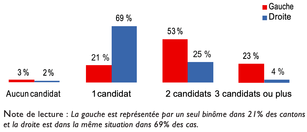 Au total, et alors que le parti de la rue de Solférino et le bloc UMP-UDI alignaient à quelques unités près (1.552 contre 1.566) le même nombre de binômes, du fait du très fort éclatement de l’offre politique à gauche le PS ne serait le seul représentant de la gauche que dans 12% des cantons alors que l’alliance UMP-UDI se retrouverait seule dans son camp au premier tour dans 54% des cantons. Le graphique 4 traduit la même idée : la gauche n’allait être représentée par un seul binôme que dans seulement 21% des cantons, alors que la droite le serait dans ce cas dans 69% des cantons.