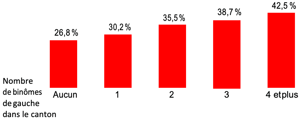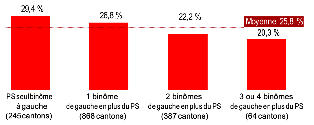 Dans les 245 cantons où le PS n’affrontait aucun concurrent à gauche, ses candidats ont été éliminés au soir du premier tour dans 29,4% des cas, alors que ce taux n’a été que de 20,3% dans les 64 cantons où le PS était face à trois ou quatre autres binômes de gauche.