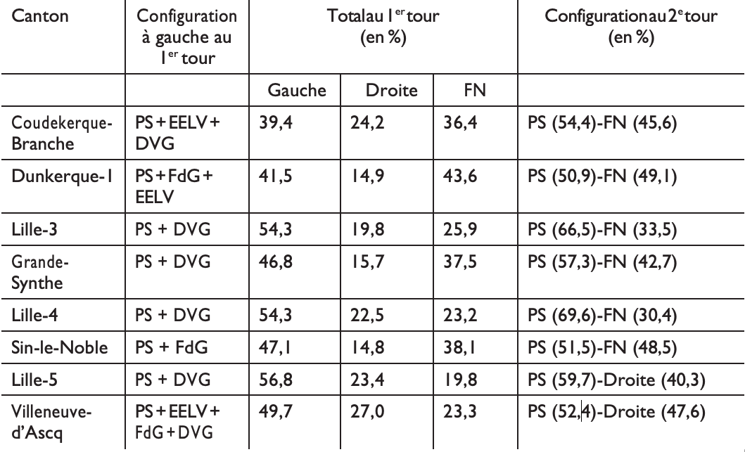 Tableau 4 : Département du Nord : bien que divisée, la gauche se qualifie au second tour dans de nombreux cantons