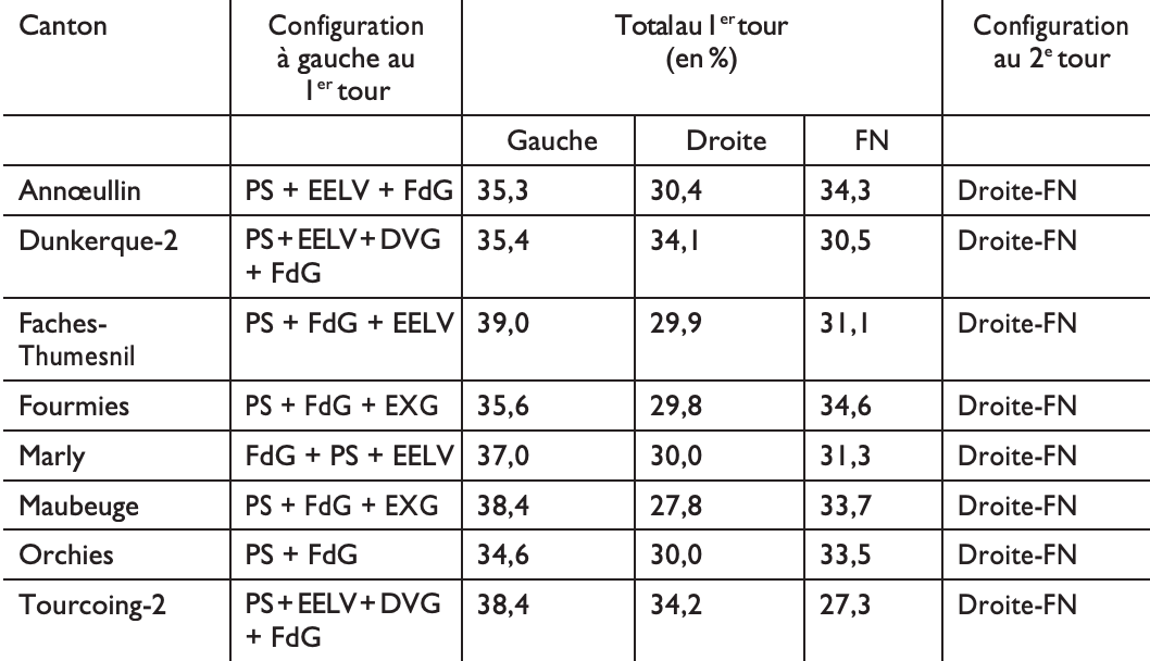 Mais dans d’autres cantons, où droite et FN étaient plus puissants, la division de la gauche (plus aboutie : trois binômes se présentant souvent contre généralement deux dans les cantons précédemment cités) a conduit à son élimination à l’issue du premier tour, alors que le total des voix de gauche était pourtant assez conséquent.