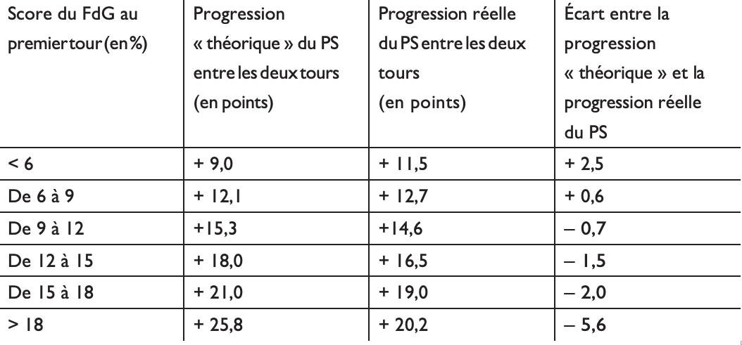 Tableau 6 : L’ écart entre la progression « théorique » et la progression réelle du PS est indexé sur le score du Front de gauche
