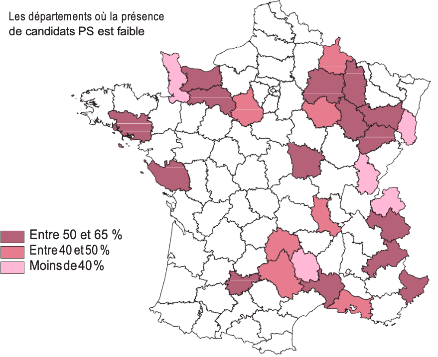 Mais il semblerait que, plus structurellement et compte tenu du climat d’opinion national très défavorable à la gauche, les socialistes (anticipant une défaite ?) n’aient pas redoublé d’efforts dans toute une série de départements historiquement acquis à la droite. On voit en effet apparaître sur la carte, en filigrane et de manière imparfaite, les bastions traditionnels de la droite. Le PS n’alignait ainsi des binômes que dans moins de 40% des cantons de Lozère, Haute-Savoie, Haut-Rhin ou de la Manche. La présence socialiste était inférieure à 50% des cantons dans l’Aube, l’Eure-et-Loir, le Cantal ou bien encore l’Aveyron, et à 65% en Vendée, dans l’Orne, le Calvados, la Marne, la Haute-Marne, la Meuse, les Vosges, la Savoie et les Alpes- Maritimes.