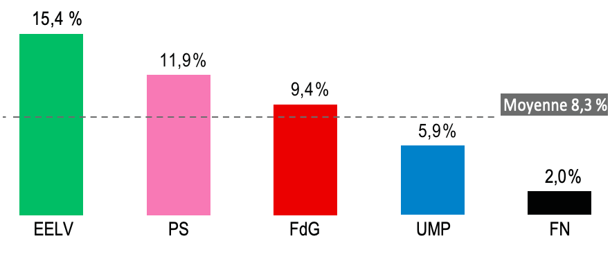 La proportion la plus élevée (8,5 %) est observée parmi les candidats divers gauche. Ceci témoigne d’un tro- pisme assez marqué en faveur de la gauche de la population issue de l’immigration mais aussi de la difficulté rencontrée par ces candidats à se faire investir par ces partis d’où le choix de candidatures indépendantes. On retrouve par exemple ce phénomène assez fréquemment en Seine-Saint-Denis.