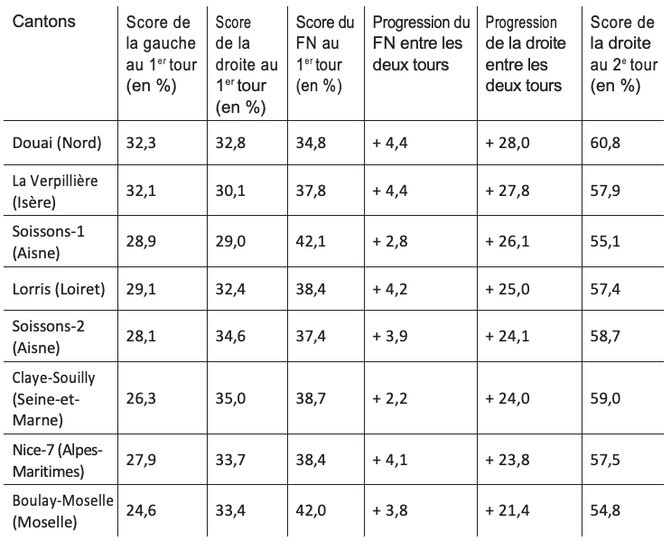 Ces chiffres montrent également une progression nettement plus importante dans les duels face à la gauche (+ 9,5 points) que dans ceux l’opposant à la droite (+ 5,4 points seulement). Ceci peut s’expliquer tout d’abord par l’ampleur du « front républicain » grâce auquel les candidats de droite ont bénéficié d’importants reports de la gauche, ce qui a freiné d’autant la dynamique frontiste dans les duels droite-FN. Ainsi, dans toute une série de cantons où avaient lieu des duels droite-FN, les candidats frontistes ont été soumis à un véritable « tir de barrage » au second tour.Ayant enregistré des scores flatteurs au premier tour et bien placés pour l’emporter, ils n’ont quasiment pas progressé au second tour quand, sous l’effet d’un puissant report des voix de gauche, les candidats de droite, pourtant souvent distancés au premier tour, voyaient eux leur score littéralement décoller, ce qui leur a permis de terrasser nettement leurs adversaires comme le montrent les quelques exemples du tableau 2.