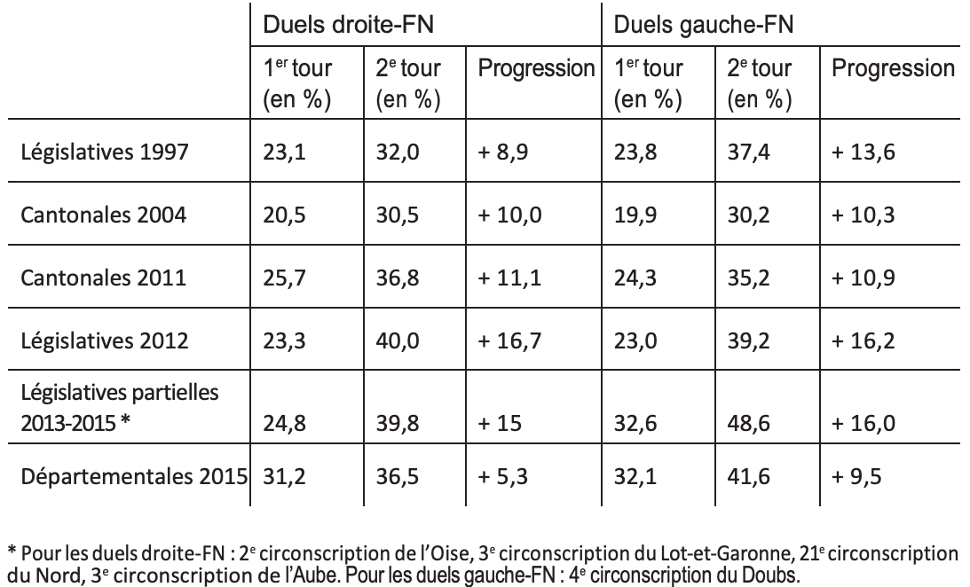 Tableau 3 : La progression du FN entre les deux tours en cas de duel lors desdifférents scrutins