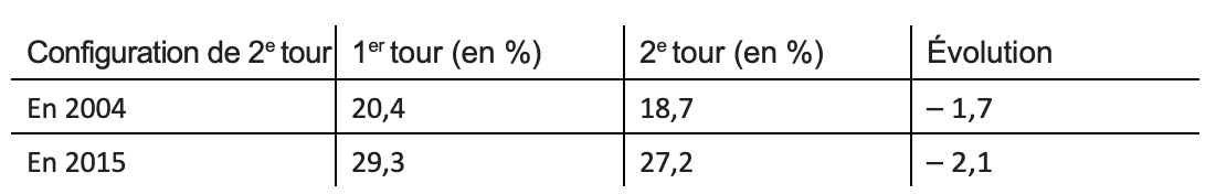 En 2004, le recul au second tour était également proche de 2 points, mais le niveau moyen atteint au premier tour était, comme pour les duels, beaucoup moins élevé (20,4%) qu’aujourd’hui (29,3%). Sous l’effet du vote utile, le FN voit donc toujours son score s’éroder dans les triangulaires, mais sa capacité de fidélisation devient plus importante puisqu’il perd en moyenne 2,1 points sur un score de 29,3% au premier tour contre 1,7 point de perdu sur 20,4% en 2004.