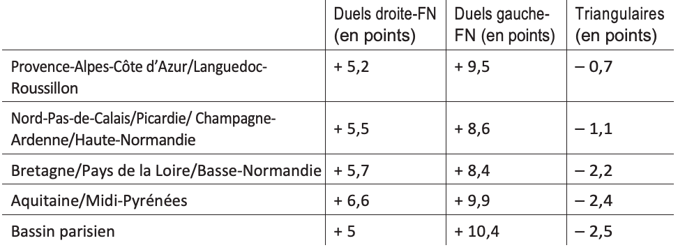 On constate juste une progression un peu plus forte du FN face à la gauche dans le Sud que dans le Nord (+ 9,5 points contre + 8,6 points), ce qui semblerait indiquer de meilleurs reports de la droite sur le FN dans les départements méditerranéens, signe d’une porosité entre droite et FN un peu plus forte au Sud qu’au Nord. Cette porosité se manifeste également plus fortement dans le Bassin parisien (Île-de-France, Eure-et-Loir, Yonne, Loiret, Aube et Marne) et dans le Sud-Ouest, mais moins dans le Grand Ouest. Et, signe que l’implantation du FN demeure plus récente et plus fragile dans ses terres de mission, on observe que c’est sur la façade ouest et dans le Bassin parisien que le tassement au second tour dans le cadre de triangulaires est le plus marqué.