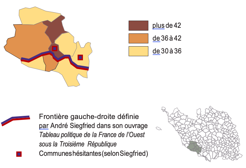 Mais, sur cette large moitié ouest du pays, la poussée frontiste ne concerne pas que les cités industrielles ou portuaires. On enregistre en effet des résultats également très élevés dans les campagnes modestes de la Sarthe (36,4% dans le canton d’Écommoy , 36,1% dans celui de La Suze-sur-Sarthe ou bien encore 33,7% dans celui du Lude) ou en Vendée. Dans ce dernier département, le canton de Talmont-Saint-Hilaire avait retenu l’attention d’André Siegfried. Dans son magistral Tableau politique de la France de l’Ouest8, il avait montré, en s’appuyant sur l’exemple de ce canton, en quoi la géologie, très contrastée sur ce petit territoire, avait conditionné le mode de culture mais aussi de peuplement (habitat groupé ou dispersé) et comment in fine ces conditions socio-économiques et culturelles avaient débouché sur des comportements électoraux très tranchés à quelques kilomètres d’écart. Le canton de Talmont-Saint-Hilaire est resté pendant des décennies coupé en deux avec, au nord, des communes au sol granitique acquises à la droite et, au sud, des communes au sol calcaire votant à gauche. La sociologie de cescommunes, à l’époque essentiellement agricoles, a bien évidemment considérablement changé depuis, mais cette opposition gauche-droite a longtemps perduré. Or il est intéressant de constater que le vote frontiste au second tour (le FN s’étant qualifié dans ce canton) a fait fi de cette frontière historique, ce qui démontre la puissance de sa dynamique et son caractère tout terrain (voir carte 1).