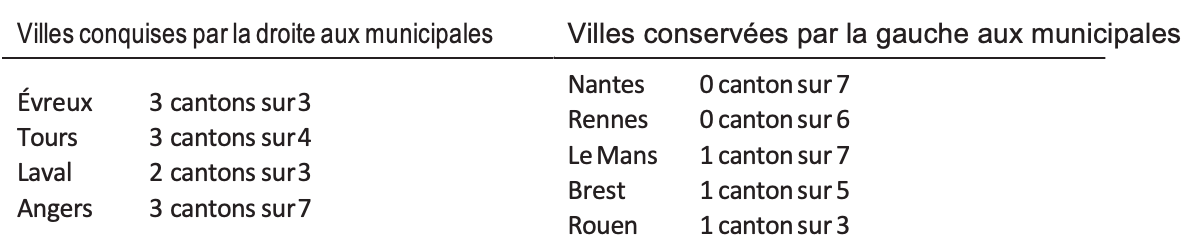 À Nantes et au Mans, où 7 cantons étaient en jeu, la droite n’en remporte qu’un seul, au Mans. La très bonne résistance de Nantes, et plus largement de son agglomération, a d’ailleurs permis à la gauche de sauver de justesse le conseil général de Loire-Atlantique (à un canton près), quand la droite raflait quasiment tous les cantons ruraux et périurbains. Mais, toujours dans cette région, la droite a à l’inverse poussé son avantage et remporté de nombreux cantons dans les villes conquises l’an dernier : 3 sur 3 à Évreux, 3 sur 4 à Tours, 2 sur 3 à Laval (Guillaume Garot, l’ancien maire, s’imposant à Laval-3 avec 55,9 des voix) et, avec un ratio un peu moins bon, à Angers, 3 sur 7.