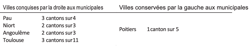 Tableau 7 : Grand Sud-Ouest : nombre de cantons remportés par la droite dans différentes villes