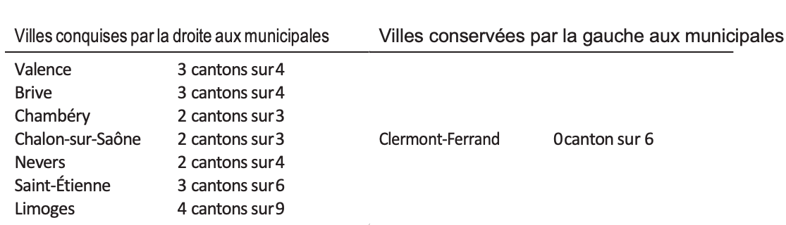 Mécaniquement, l’effet domino a essentiellement profité à la droite aux départementales, puisque c’est elle qui avait remporté haut la main les municipales de l’année précédente. Mais il est intéressant de constater que les gauches en ont aussibénéficié dans les villes qu’elles avaient conquises ou dans lesquelles des listes dissidentes avaient évincé le PS.