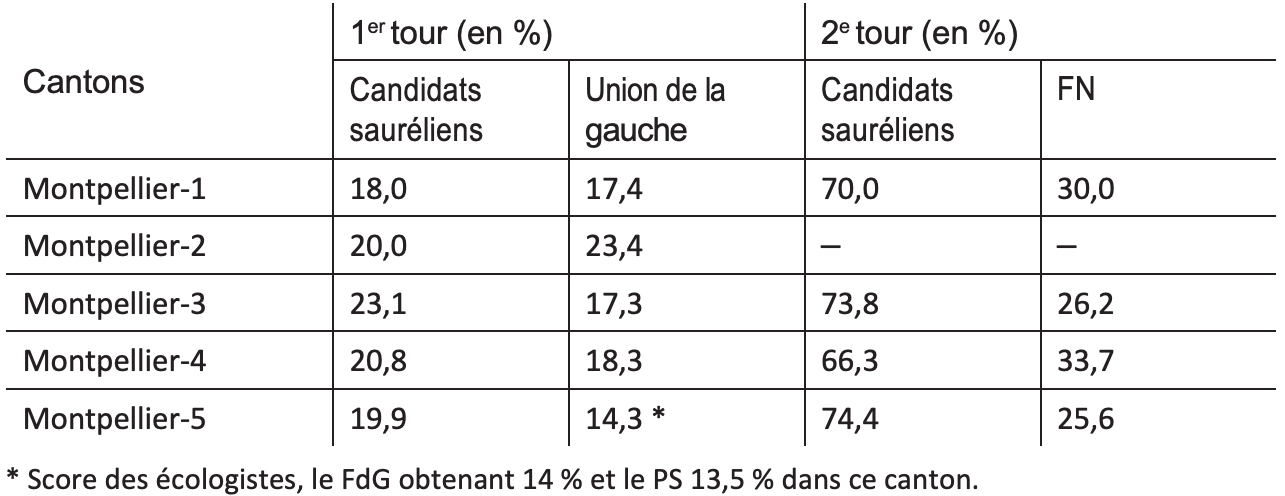 À Montpellier, soucieux d’affirmer son emprise sur son territoire et de peser au conseil général, Philippe Saurel a présenté face à la gauche « officielle » des binômes dans 5 des 6 cantons (voir tableau 10). Fort de la dynamique enclenchée lors des municipales et des faiblesses d’un appareil socialiste ayant du mal à se renouveler après l’ère Frêche, 4 de ces 5 binômes sont parvenus au premier tour à coiffer au poteau lesbinômes socialistes dans les cantons de Montpellier-1, Montpellier-3 et Montpellier-4,ou à arriver en tête de la gauche à Montpellier-5, où le PS, le FdG et EELV partaient chacun sous leurs couleurs. Et dans le canton de Montpellier-2, le binôme saurélien a raté de peu la qualification, avec 20% contre 23,4% pour le PS.
