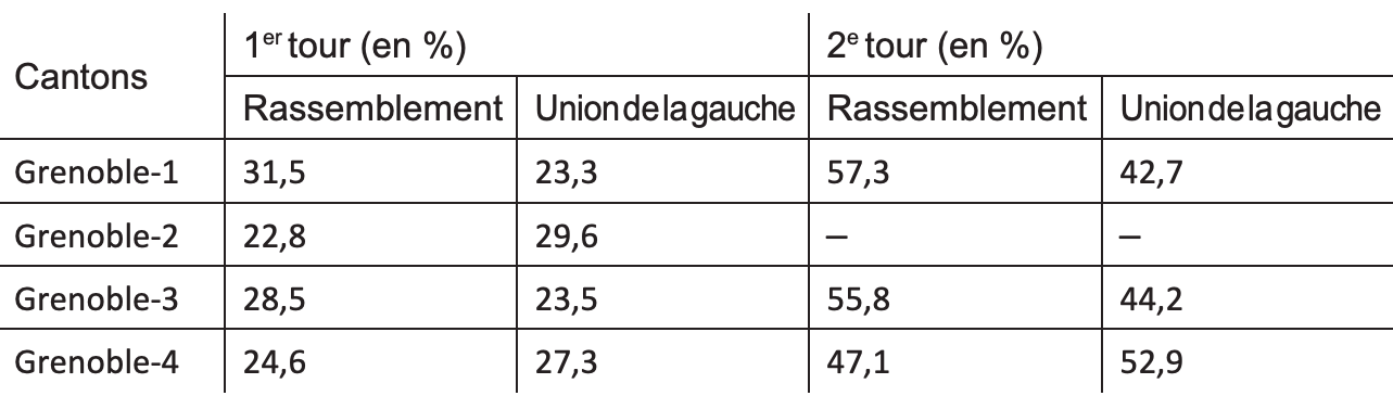 À Grenoble, la victoire de la coalition rouge-verte aux municipales avait nourri de nombreux espoirs à la « gauche de la gauche », qui entendait renouveler cet exploit aux départementales et l’amplifier à l’échelle du département. À cette fin, le Rassemblement (regroupant les mêmes forces qu’aux municipales) présenta des binômes dans pas moins de 23 cantons isériens sur 29 et, bien évidemment, dans les 4 cantons grenoblois14 (voir tableau 11). Et, ici aussi, l’effet domino a en partie fonctionné dans la mesure où le Rassemblement a devancé l’Union de la gauche (PS +PCF) au premier tour dans les cantons de Grenoble-1 et Grenoble-3 (il en va de même dans la partie grenobloise du canton de Grenoble-2, le Rassemblement y obtenant 33,3% contre 25,3% pour l’Union de la gauche, cette dernière reprenant l’ascendant dans les autres communes intégrées dans ce canton) et s’est qualifié pour le second tour face à la gauche dans le canton de Grenoble-4.