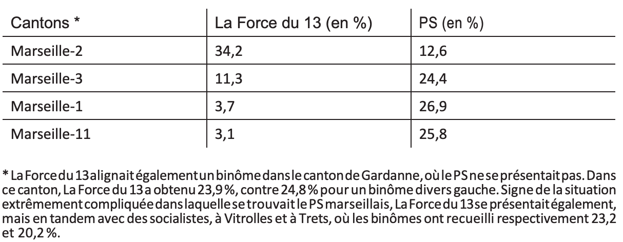 Tableau 12 : Les scores des binômes de La Force du 13 et du PS à Marseille