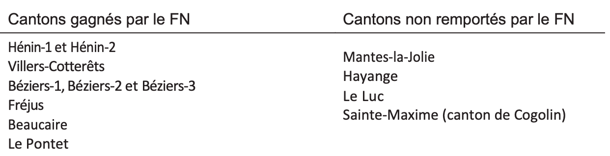 Dans les quatre autres cas, le FN ne remporte pas le canton, mais il est en tête au second tour dans la commune, à Hayange, à Cogolin et au Luc. Il n’y a qu’à Mantes-la-Ville, ville conquise de justesse et à la faveur d’une quadrangulaire aux municipales, que le binôme frontiste, composé notamment du maire Cyril Nauth, est battu.