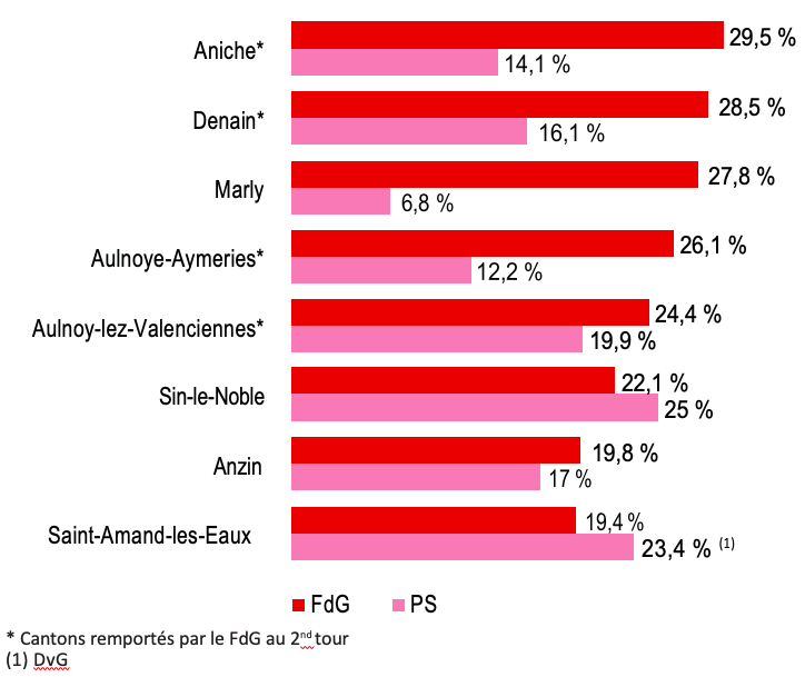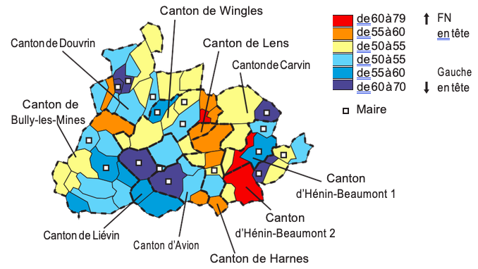 À partir d’Hénin-Beaumont, dont la mairie a été remportée au premier tour en mars 2014, le FN a poursuivi sa stratégie de conquête de l’ensemble du bassin minier. Dans le département du Pas-de-Calais, ce ne sont pas moins de 6 cantons qui ont été gagnés : les 2 cantons d’Hénin, mais aussi celui de Wingles, de Harnes, de Lens, tous limitrophes des cantons héninois, et celui, un peu plus excentré, de Lillers. L’effet domino a donc fonctionné à plein ici, et il s’est même agi d’une véritable contagion àpartir de l’épicentre héninois puisqu’à ces cantons tombés dans l’escarcelle frontiste sesont ajoutés d’autres cantons miniers où les candidats lepénistes, ici aussi en duel face àla gauche (socialiste ou communiste), ont atteint des résultats impressionnants et, parfois, frôlé la victoire.