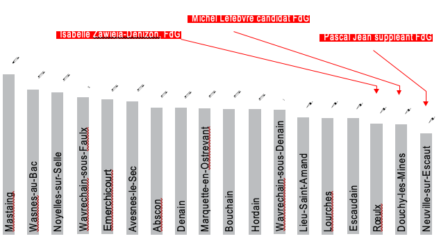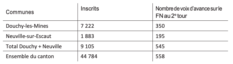 Michel Lefebvre, maire de Douchy-les-Mines, était candidat, et son collègue, Pascal Jean, maire de Neuville-sur-Escaut, son suppléant. Sur l’ensemble du canton, le binôme du FdG ne bénéficie que de 558 voix d’avance sur le FN (voir tableau 14). Or ces deux communes, qui ne pèsent que 20% de l’ensemble des inscrits du canton, ontfourni 545 voix d’avance, soit la quasi- totalité de l’avance. Sans cet ancrage et le choixde présenter des maires aux départementales, le canton aurait sans doute été remporté par le FN.