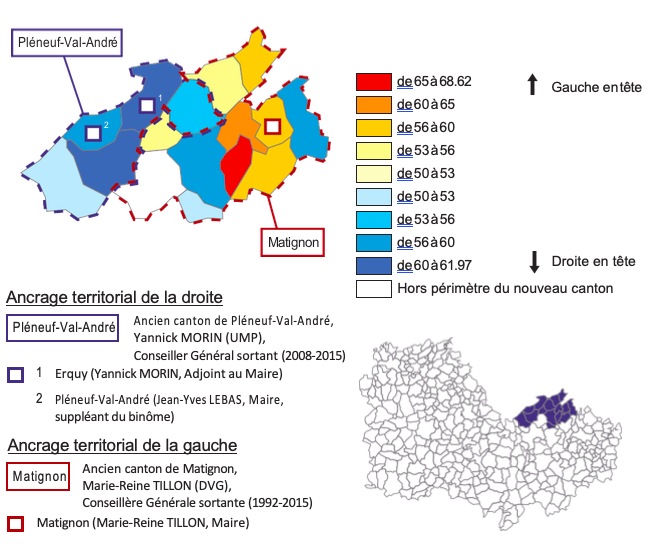 Dans les Côtes-d’Armor, dans le canton de Pléneuf-Val-André (composé des anciens cantons de Pléneuf et de Matignon), Yannick Morin, conseiller général sortant UMP, a très nettement devancé dans son ancien canton de Pléneuf-Val-André la conseillère générale socialiste sortante du canton de Matignon, Marie-Reine Tillon, avec un score au second tour de 58,2% contre 41,8% (voir carte 3). Cette avance de plus de 1.100 voix s’explique sans doute en partie par le fait que la droite a « bétonné » ses positions en alignant, en plus de Yannick Morin, sortant et adjoint au maire d’Erquy18, Jean-Yves Le Bas, maire de Pléneuf-Val-André et suppléant du binôme. Dans l’ancien canton de Matignon, Marie-Reine Tillon, conseillère en place depuis 1992, s’est certes appuyée sur son mandat de maire de Matignon, mais elle ne comptait pas d’autres maires dans son binôme et parmi ses suppléants.Elle arrive certes en tête dans le périmètre de son ancien canton (50,9% contre 49,1%), mais avec une avance de 110 voix seulement, ce qui est totalement insuffisant pour combler le retard enregistré dans l’ex- canton de Pléneuf-Val-André.
