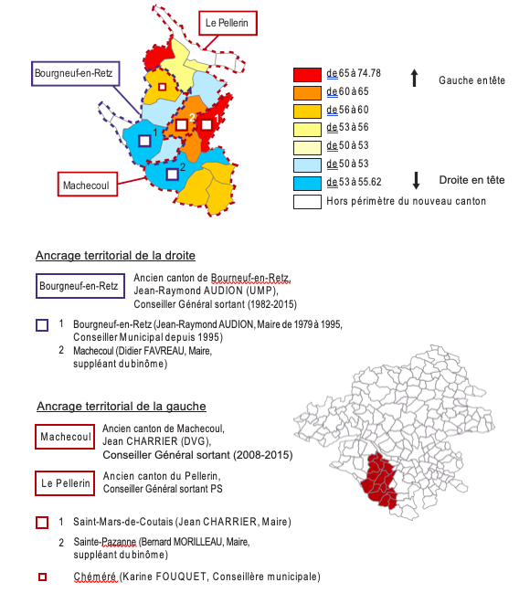 Sur la seule commune de Machecoul, la droite est en tête avec 53,1% des voix, mais elle est seconde dans les cinq autres communes du canton.