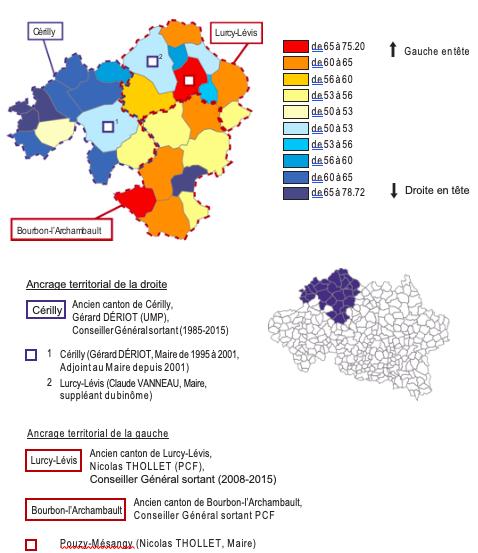 Inversement, le basculement à droite du conseil général de l’Allier, précédemment dirigé par les communistes, a été abondamment commenté et érigé en symbole de la vague bleue et des difficultés rencontrées par la gauche et le PCF à maintenir leurs positions. Pour spectaculaire qu’il soit, ce basculement n’a pas pour autant été engendrépar un mouvement massif. Le changement de majorité s’est joué à un canton près, et lecanton qui a permis la bascule, celui de Bourbon-l’Archambault, n’a été conquis par ladroite sur le PCF qu’avec 48 voix d’avance (voir tableau 15). Dans ce nouveau canton issu du regroupement des anciens cantons de Bourbon-l’Archambault, Lurcy- Lévis etCérilly, on assistait également, comme dans les exemples précédents à un affrontemententre deux sortants. La droite était représentée par Gérard Dériot, sénateur, ancien conseiller général du canton de Cérilly20 ayant récemment démissionné de son mandat au profit de Corinne Trebosc, qui n’était autre que son binôme pour cette élection. Face à eux, le PCF alignait dans ces campagnes rouges du Bourbonnais, Nicolas Thollet, conseiller général sortant du canton de Lurcy-Lévis et maire de la commune dePouzy- Mésangy. Mais ni son binôme ni ses suppléants n’avaient de mandats locaux significatifs, et son collègue, Gilles Mazuel, conseiller général communiste sortant ducanton de Bourbon-l’Archambault, ne se représentait pas. Face à ce dispositif assez parcellaire, le binôme de droite disposait, quant à lui, d’un relais à l’extérieur de son fief de Cérilly, en la personne de Claude Vanneau, suppléant du binôme et maire de Lurcy-Lévis, commune située dans l’ancien canton du candidat communiste être présentant le quart du corps électoral du canton. Au second tour, dans cettecommune, la droite a viré en tête avec 51,7%, soit une avance de 27 voix, auxquelles on peut ajouter les 18 voix d’avance fournies par la petite commune voisine de Neure21. Ces points d’appui de la droite dans le canton de l’adversaire ont contribué àminimiser l’avance prise par le PCF dans le fief de son candidat, qui y obtient 53,2% des voix, soit seulement 132 voix d’avance.