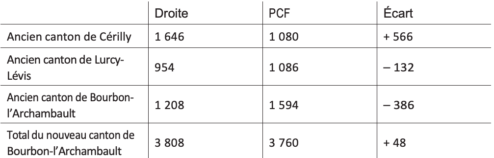 Tableau 15 : Nombre de voix obtenues par la droite et le PCF au second tour dansles trois anciens cantons du canton de Bourbon-l’Archambault