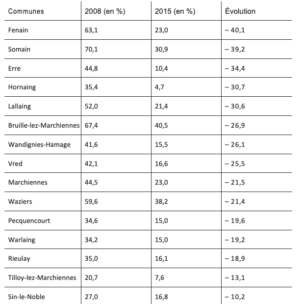 Tableau 16 : Score comparé du PCF en 2008 et du Front de gauche en 2015 aupremier tour dans les communes du nouveau canton de Sin-le-Noble
