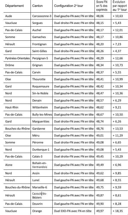 Cantons où le FN a été battu, mais où il a réalisé plus de 48% des voix