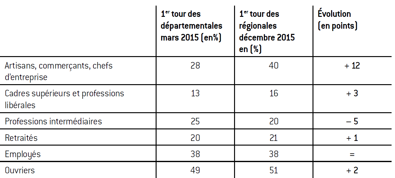 Disposant de bases toujours aussi solides dans ses catégories phares, le Front national diffuse son audience dans d’autres strates sociologiques de la population, ce mouvement amenant à la progression de son score au niveau global.