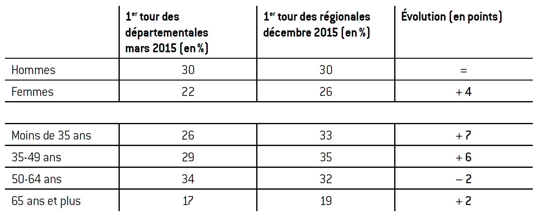Par rapport aux élections départementales de mars 2015 (où le niveau d’abstention a été quasiment identique, ce qui permet de faire des comparaisons sur un corps électoral similaire), on constate une légère progression chez les femmes (+4 points, contre une stabilité du score parmi les hommes) et un gain assez conséquent dans les générations les plus jeunes : +7 points auprès des moins de 35 ans et +6 points auprès des 35-49 ans. Le gain est en revanche quasiment nul dans les tranches d’âge plus âgées : –2 points chez les 50-64 ans et +2 points parmi les 65 ans et plus. Pour les seniors, bien que le Front national y dispose d’une marge de progression, la dynamique qui a été observée chez les plus jeunes ne s’est donc pas produite, et cette tranche d’âge est restée majoritairement ancrée à droite (40% pour les listes de droite parmi les 65 ans et plus).