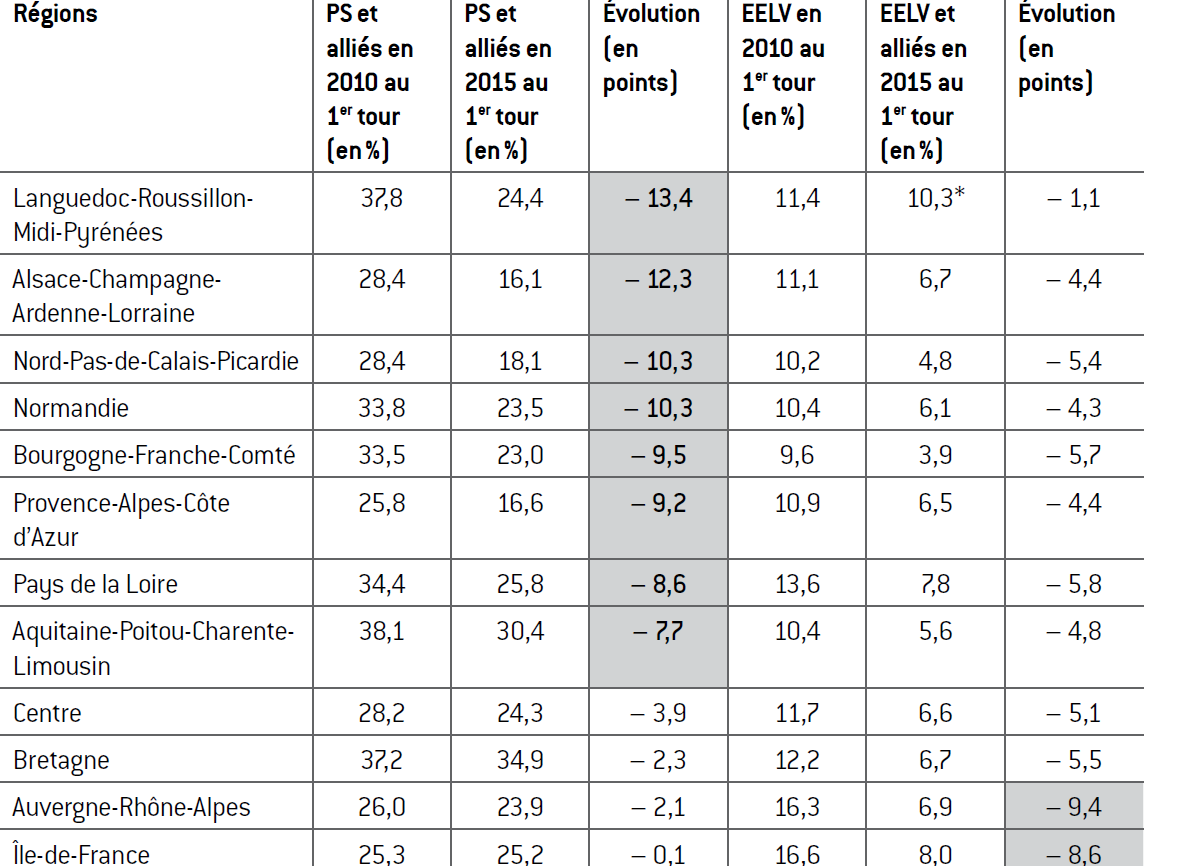 Tableau 1 : Évolution entre 2010 et 2015 du score du Parti socialiste (PS) et d’Europe Écologie-Les Verts (EELV) au 1er tour des éléctions régionales