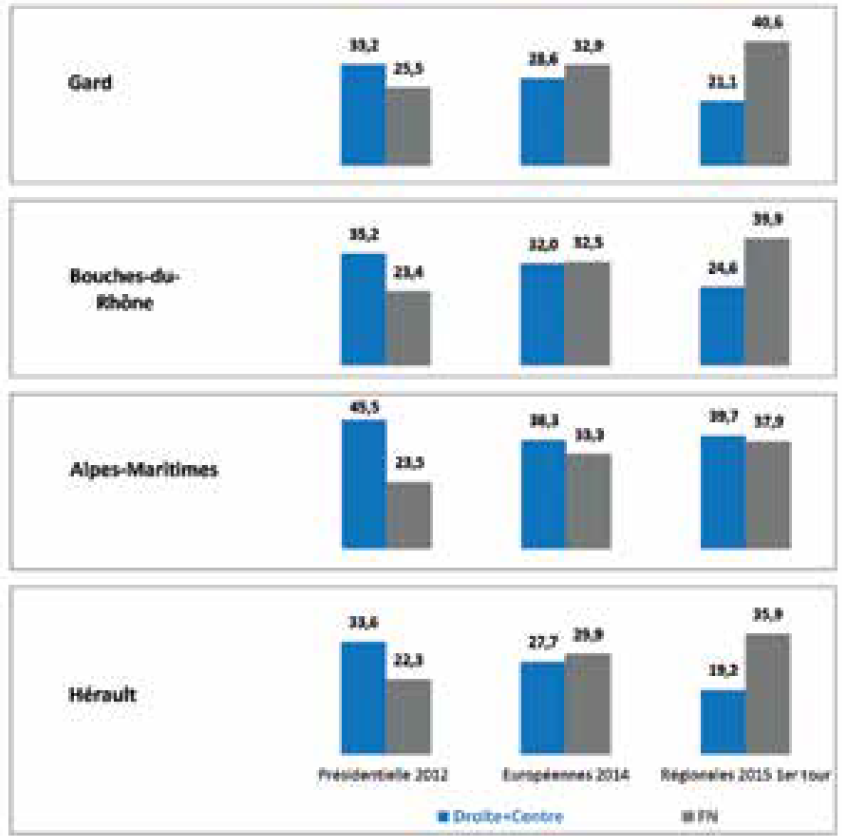 Dans certains départements méditerranéens où la poussée frontiste a été très forte, cette montée en puissance, scrutin après scrutin, s’est accompagnée d’un décrochage parallèle de la droite à tel point que le rapport de force entre le Front national et la droite s’est inversé en trois ans. Dans des départements comme le Vaucluse, le Var, le Gard ou les Pyrénées-Orientales, c’est désormais le Front national qui est devenu la force dominante à droite comme le montre le graphique 5.