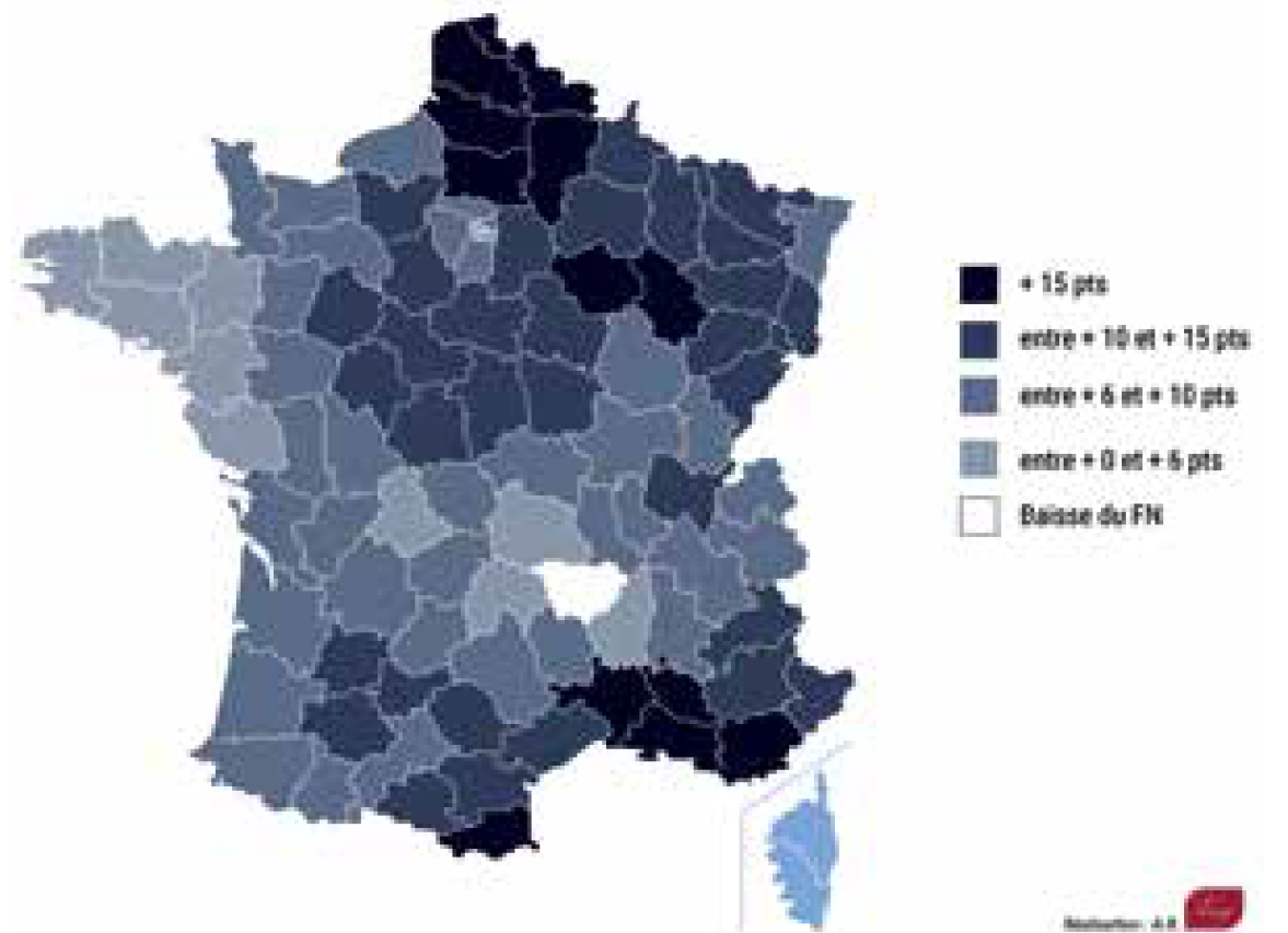 Par rapport au score de Marine Le Pen à l’élection présidentielle (18%), le Front national progresse donc de plus de 10 points en trois ans seulement. La poussée est particulièrement spectaculaire (progression supérieure à 15 points) en Nord-Pas-de-Calais-Picardie, dans la plupart des départements de Provence-Alpes-Côte d’Azur et de Languedoc-Roussillon, mais aussi dans l’Aube et en Haute-Marne. Le gain s’établit entre 10 et 15 points dans le Bassin parisien élargi, en Alsace-Champagne-Ardenne-Lorraine, mais aussi dans la vallée de la Garonne. Le mouvement est moins puissant en Île-de- France, en Bretagne et en Auvergne (la Haute-Loire de Laurent Wauquiez étant symboliquement le seul département où le Front national a reculé par rapport à 2012, –2 points).