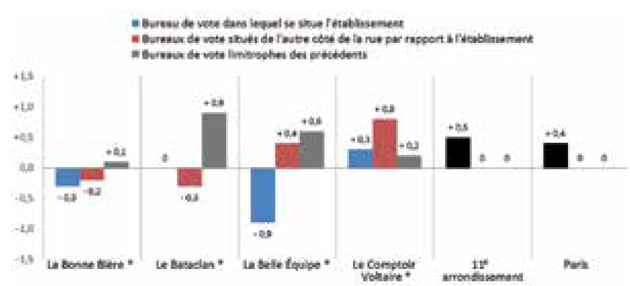 Le parti lepéniste n’a pas davantage progressé dans le 10e arrondissement. Il recule même de 0,3 point dans le bureau de vote dont le périmètre englobe Le Petit Cambodge et Le Carillon. Il ne gagne qu’un point dans le bureau de vote comprenant les habitations situées de l’autre côté de la rue et l’évolution s’établit en moyenne à +0,1 dans les six bureaux limitrophes et à +0,7 à l’échelle de l’ensemble de l’arrondissement, ces chiffres invalidant l’hypothèse d’une réaction très localisée de l’électorat.