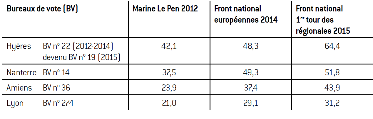 À Hyères, Amiens et Lyon, il s’agit de casernes de gendarmes mobiles, et à Nanterre, d’une caserne de la garde républicaine. Le bureau de Nanterre présente une autre spécificité qui est de ne compter parmi les inscrits sur la liste électorale uniquement que des gendarmes (en l’occurrence des gardes républicains) et leurs familles, alors que, dans les autres exemples cités, la population de gendarmes constitue certes une part importante du corps électoral du bureau de vote mais est associée à des «civils» habitant le quartier qui votent également dans le même bureau. Le cas de Nanterre permet donc de disposer d’un échantillon «chimiquement pur» pour suivre le vote des gendarmes, même s’il s’agit d’un corps spécifique qui est celui de la garde républicaine.