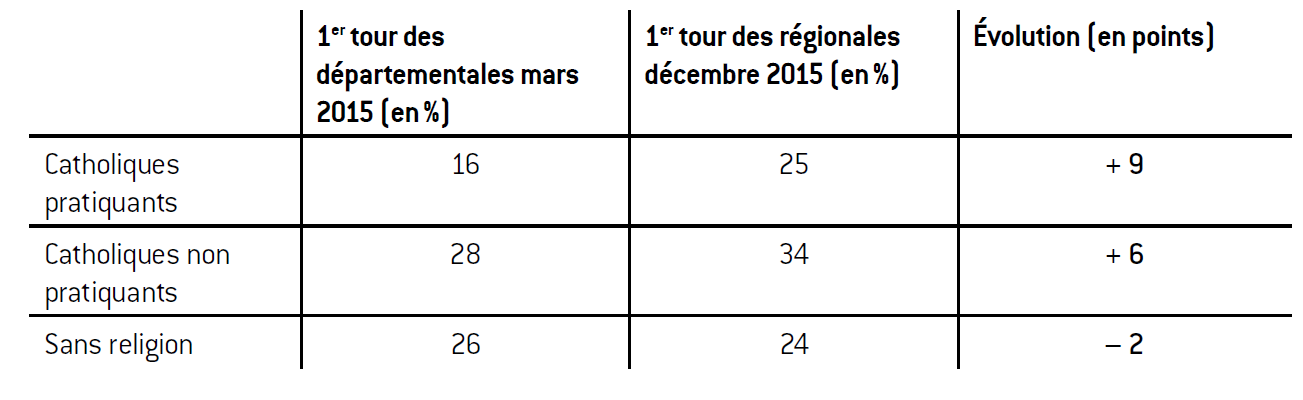 Parallèlement à ces mouvements géographiques plus ou moins localisés, on voit aussi, et c’est un autre des enseignements de ce scrutin concernant le Front national, qu’un phénomène de rattrapage s’est opéré parmi les catholiques pratiquants. Entre les élections départementales et le premier tour des régionales, le vote Front national y est ainsi passé de 16 à 25%, soit une progression de 9 points6.