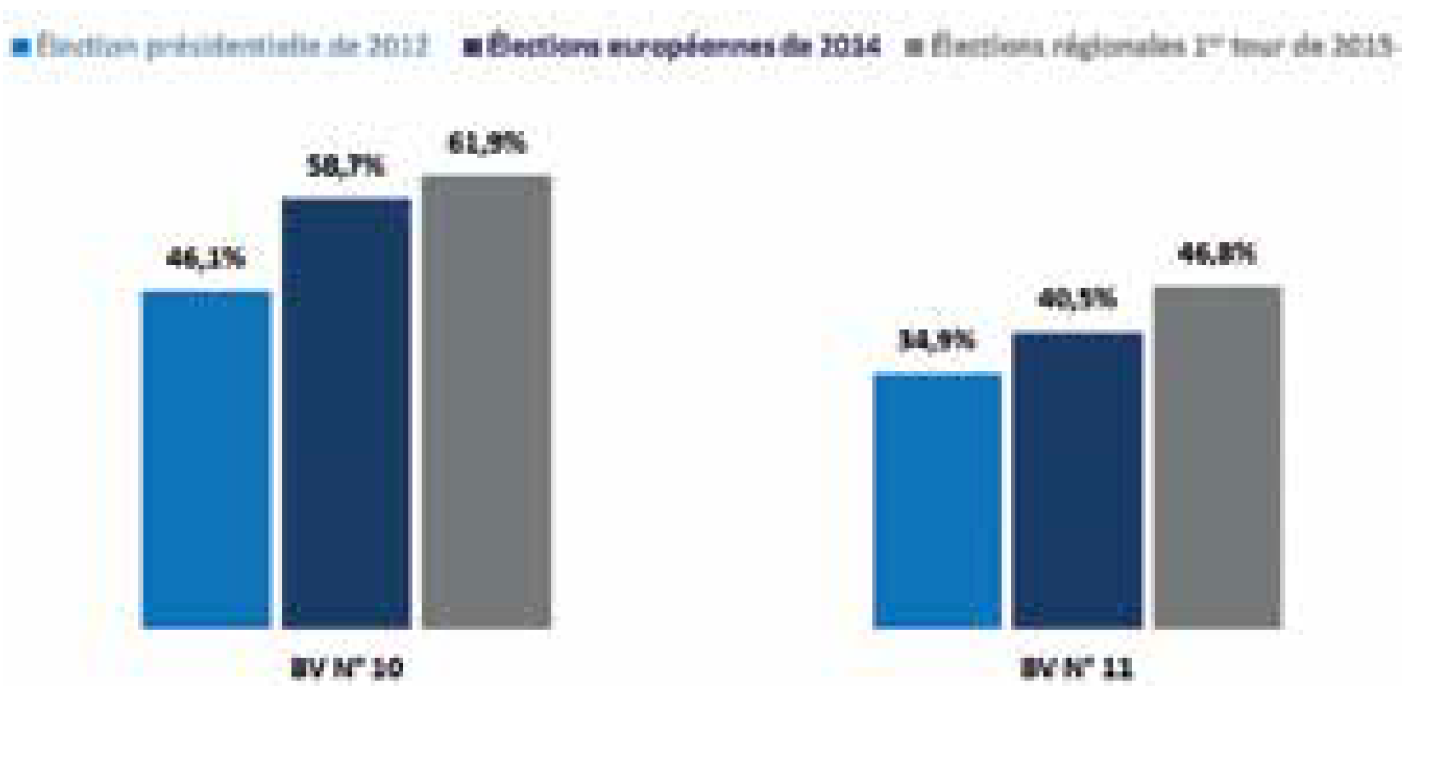 Deux autres bureaux présentent les mêmes caractéristiques, il s’agit des bureaux nos 10 et 11 de Versailles, qui correspondent au camp de Satory. Ce camp abrite des militaires, des unités blindées de la gendarmerie, mais aussi le très prestigieux GIGN, engagé en première ligne face aux frères Kouachi à Dammartin-en-Goële. Dans ces deux bureaux également, la progression du vote frontiste a eu lieu entre 2012 et 2014, puis de nouveau entre 2014 et 2015.